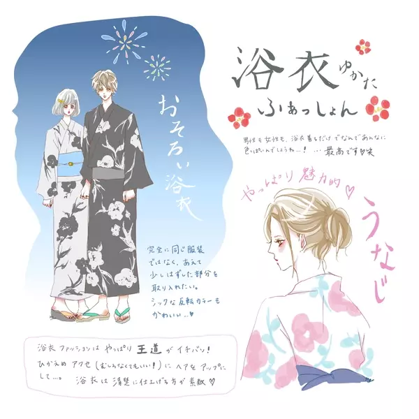 夏祭りで愛が深まるおそろいカップル浴衣コーデ イラスト