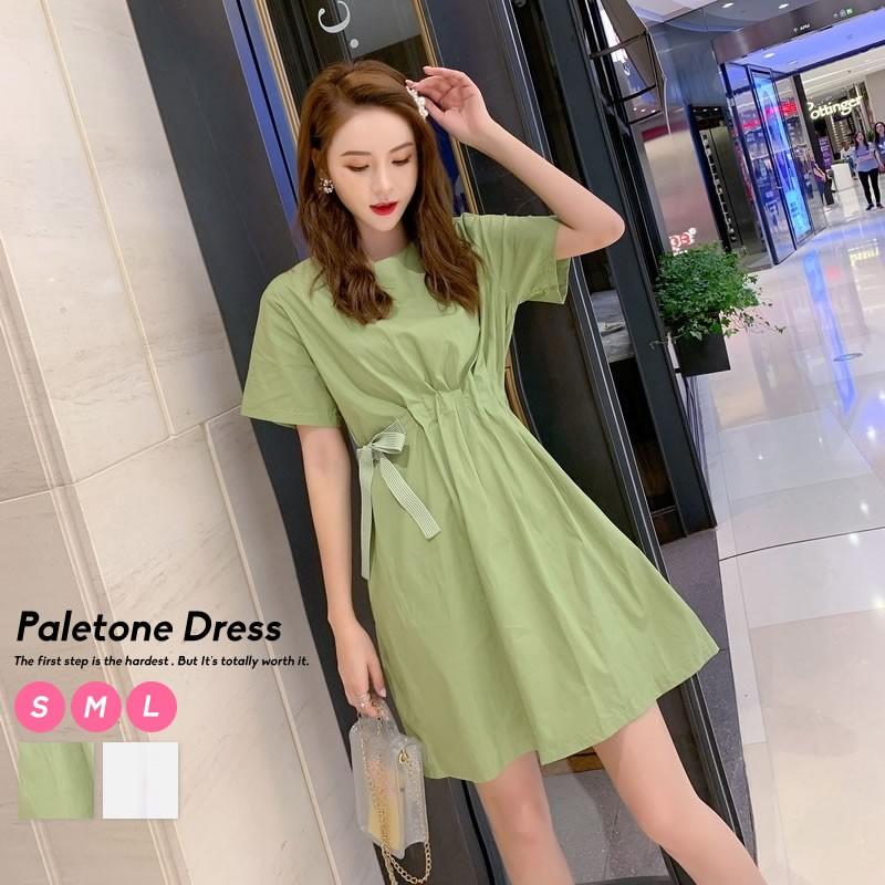 韓国 ファッション ワンピース 春 夏 ウエストリボン ペールトーン